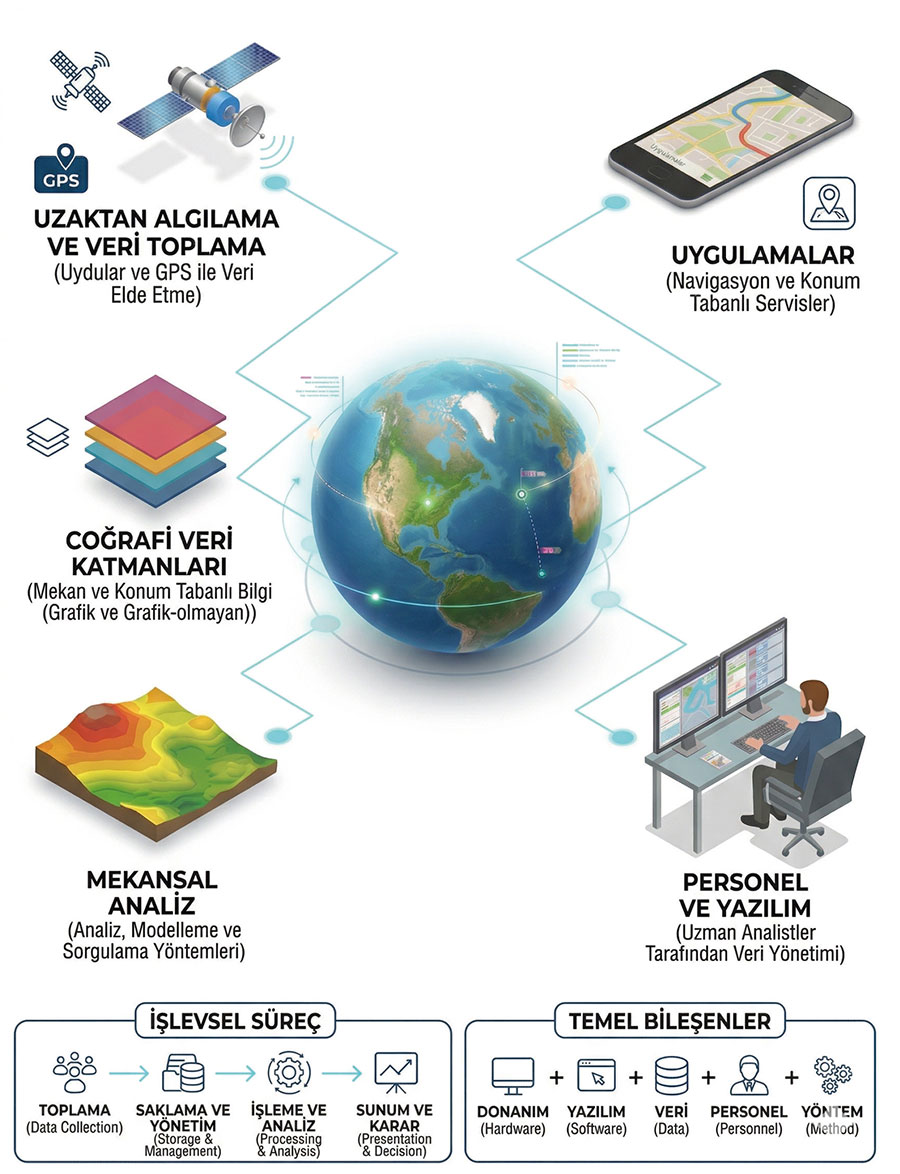 Coğrafi Bilgi Sistemleri; konuma dayalı gözlemlerle elde edilen grafik ve grafik-olmayan bilgilerin toplanması, saklanması, işlenmesi ve kullanıcıya sunulması işlevlerini bütünlük içerisinde gerçekleştiren bir bilgi sistemidir.